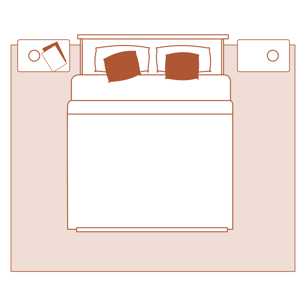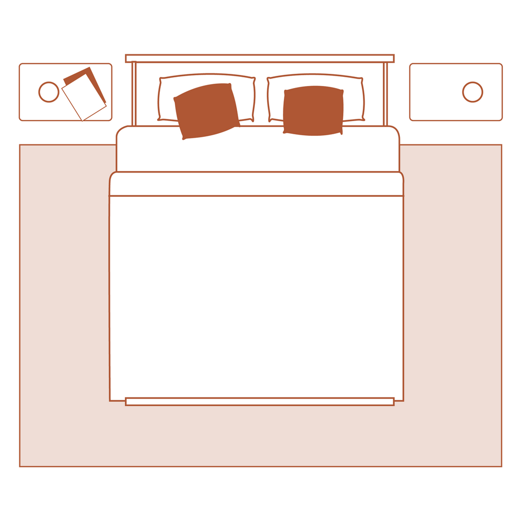 The rule of thumb is to place rug under approximately 2/3 of the bed. Keep at least 25-30cm between the rug and the front of the bedside tables. The rug should extend at least 50cm out from the sides of the bed to provide a luxurious resting place for your feet when you get in and out of bed.