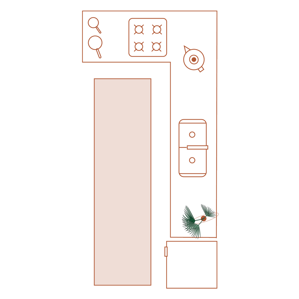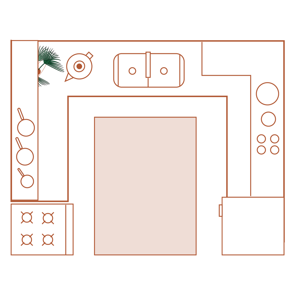 For a high traffic u-shape kitchen we recommend a small rectangular rug in front of the kitchen sink. Another option is a round rug in the center of the u-shape.