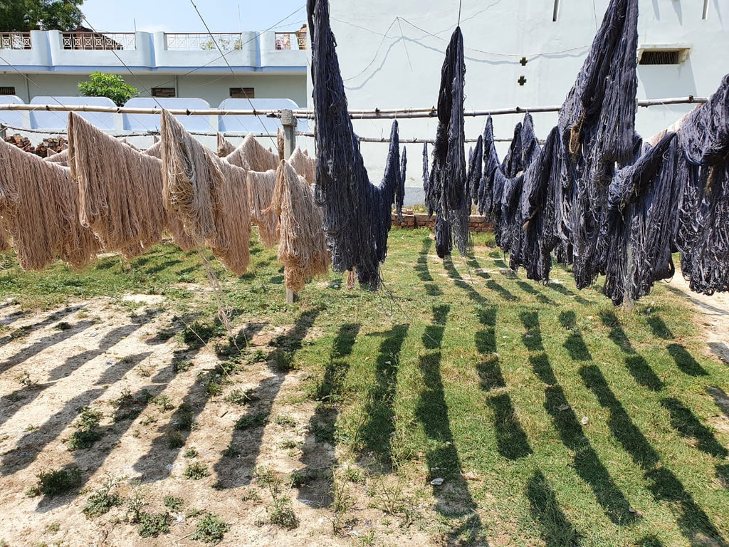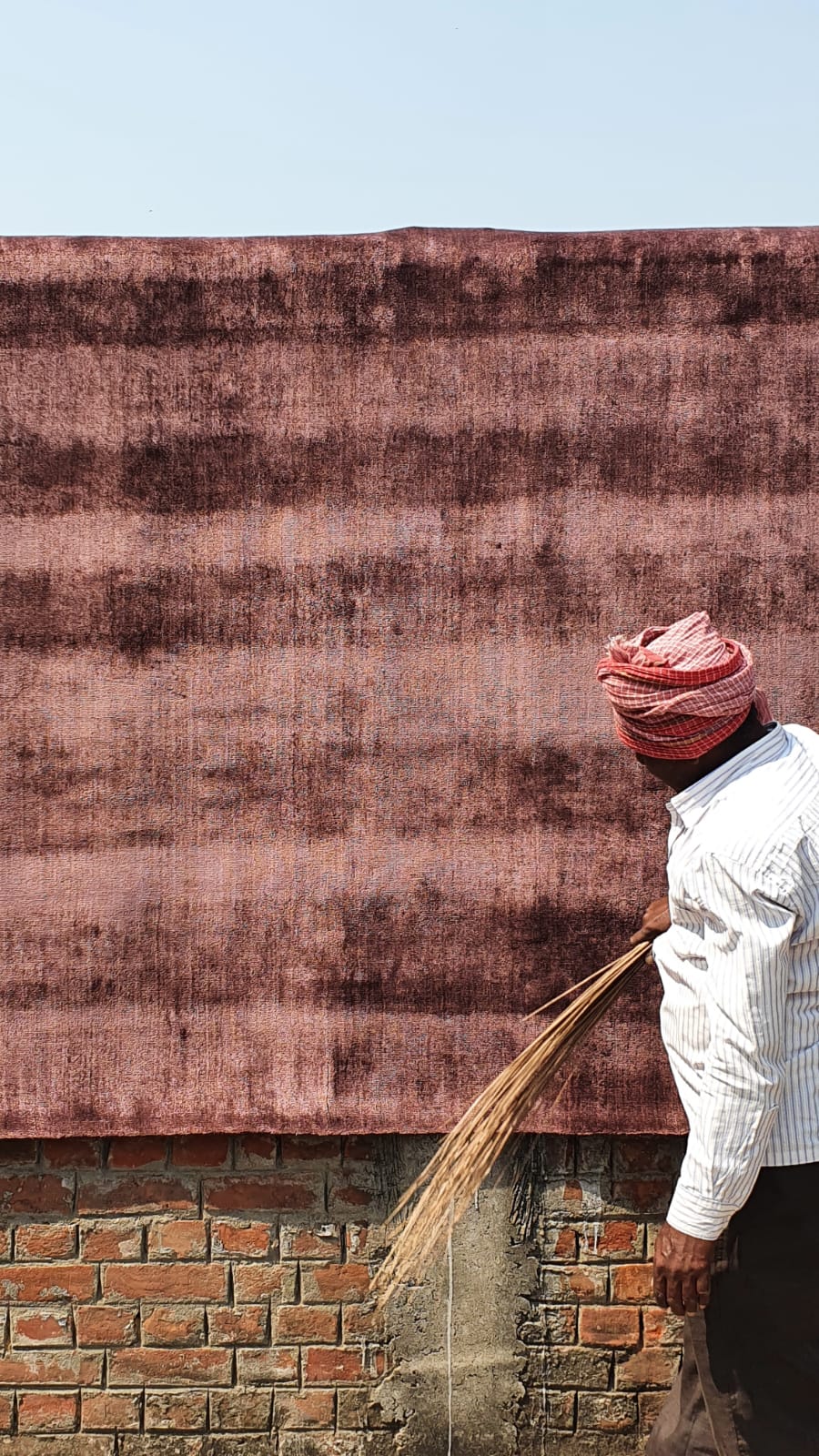 The dyeing is done by master colour specialists who have refined their skills through generations. Dyeing is done by turning the wool through cauldrons of dye that sit above a wood fire. In large batches, that are processed in a trough with the fibre hung over thick bamboo sticks. It is then dried in the sunshine out in the rural fields of Bhadohi.