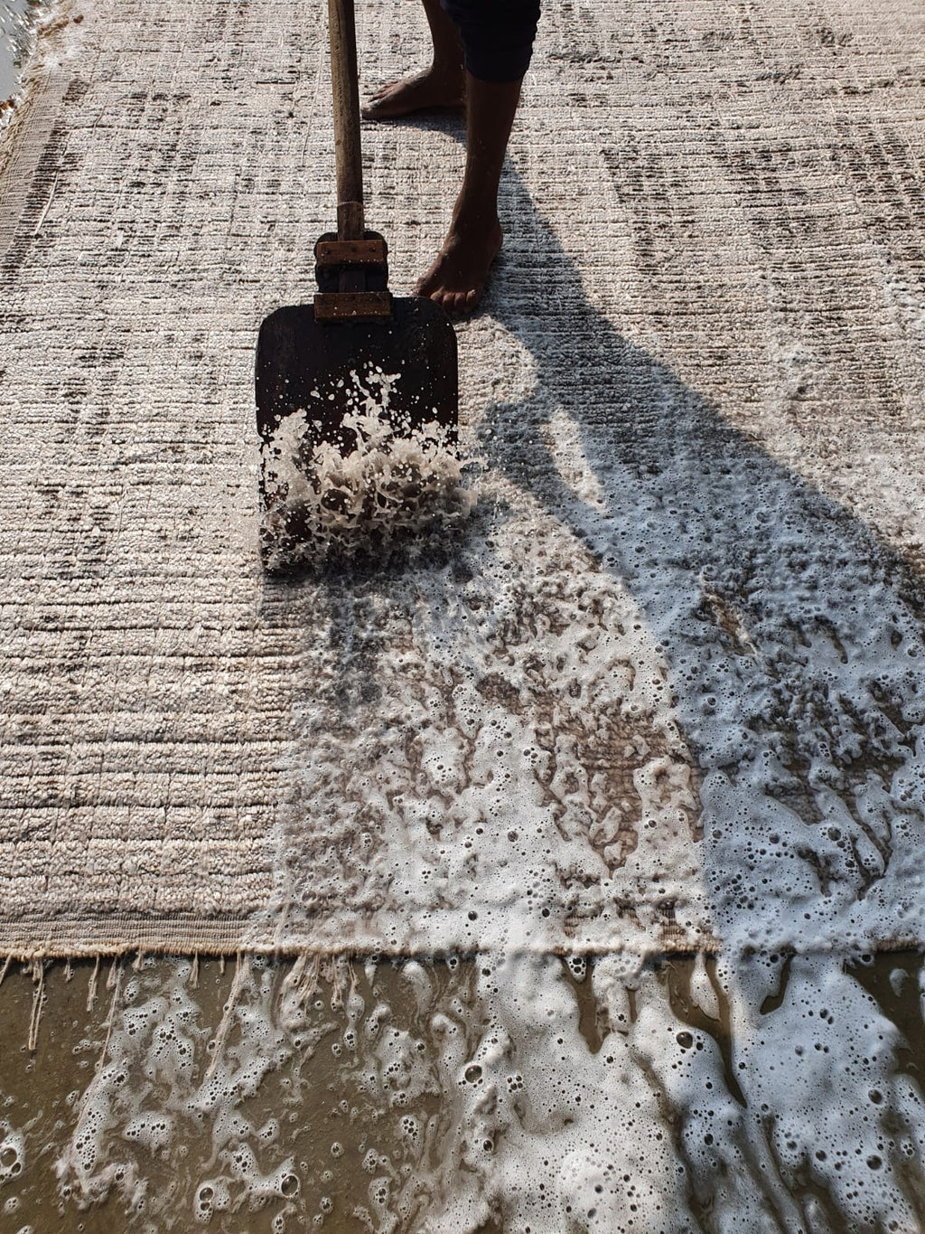 The washing of one rug can take up to 4 hours. It is done outside with buckets of soapy water and wooden paddles are used to squeeze out the water. It is then combed to remove any loose fibres and is rinsed the same way. It is then hung out to dry in the fields on large bamboo sticks.