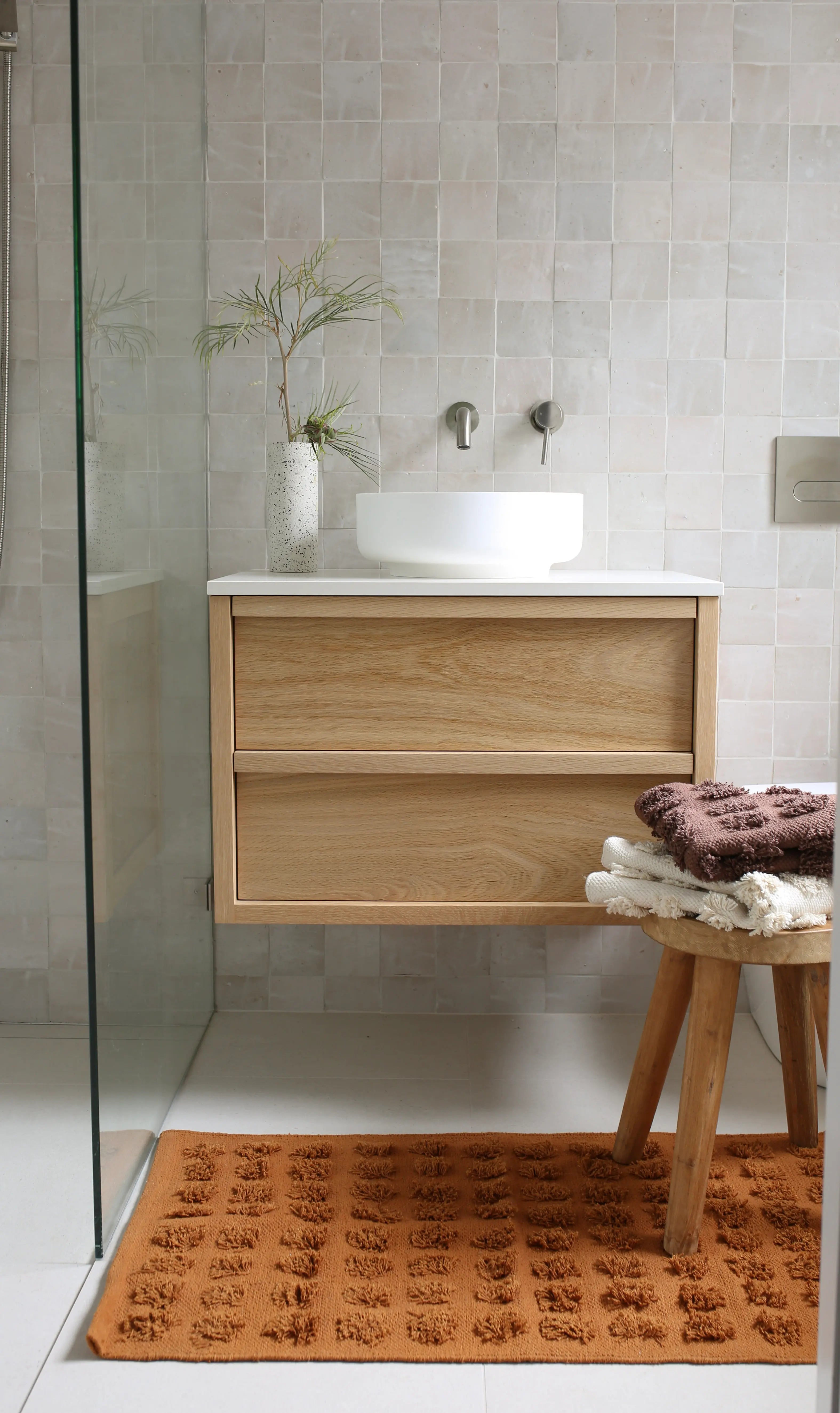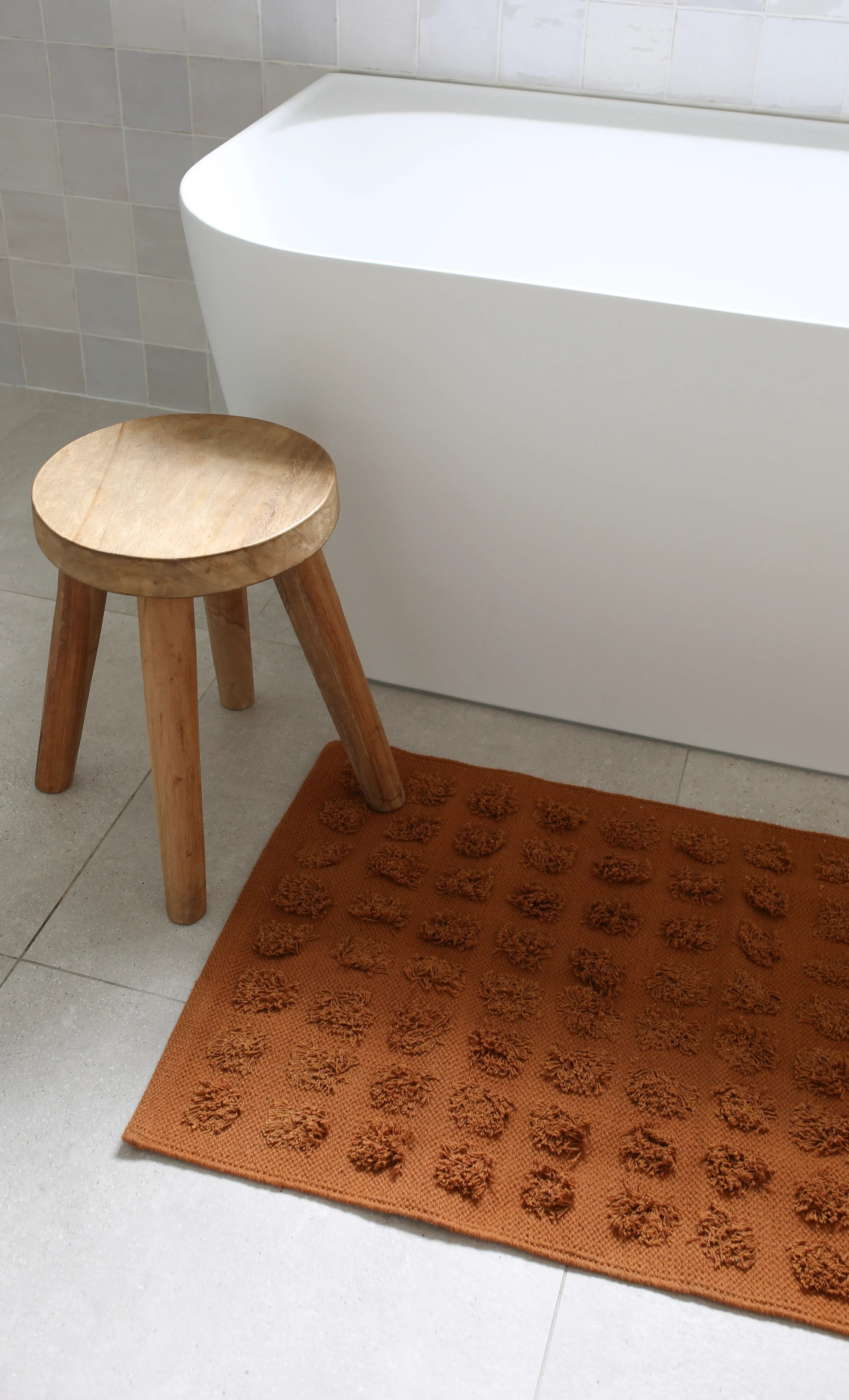 Featuring a grid of raised pom textures, each piece is thoughtfully woven by skilled artisans using time-honoured techniques. The result is a bathmat that feels plush underfoot while adding an inviting, playful touch to your space.